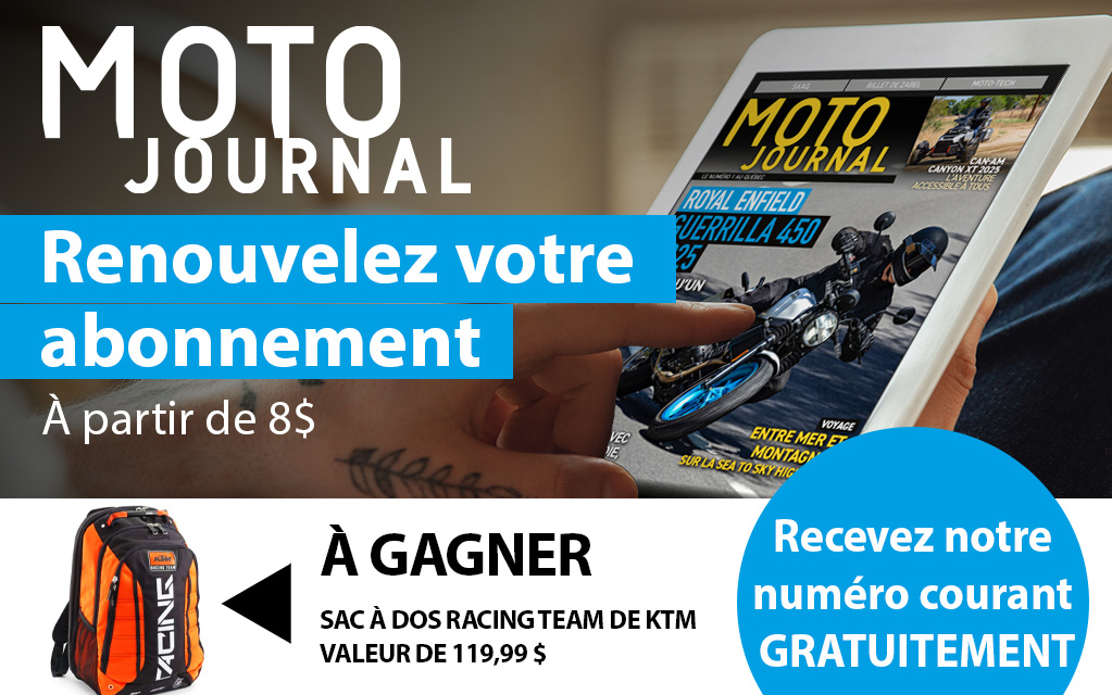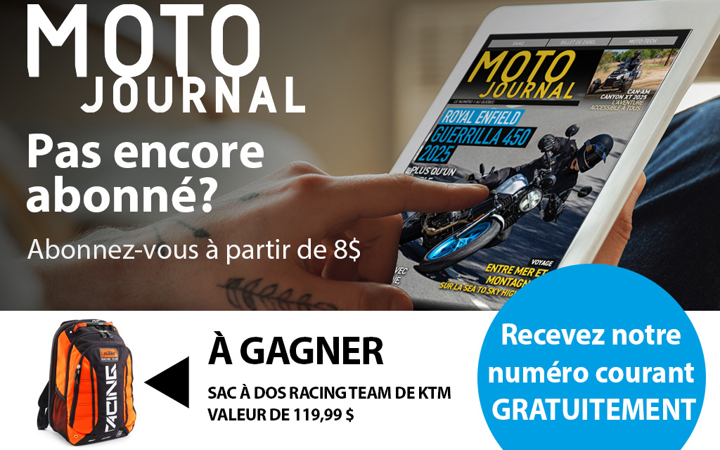 Le tirage du sac à dos Racing Team de KTM aura lieu le 20 avril 2026. Vous avez jusqu’au 19 avril 2026 à 23h59 pour participer en vous abonnant ou en renouvelant votre abonnement au magazine numérique Moto Journal. Cliquez ici pour lire les règlements du concours.