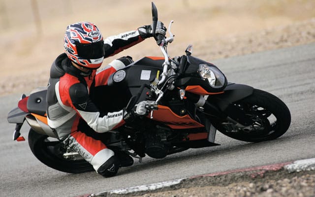 Malgré tous ces handicaps, la Super Duke a gardé sa composition, dans un environnement hostile où de nombreuses sportives pures et dures auraient rendu les armes. Le large guidon tubulaire facilite les changements d’angles et la négociation de la chicane, tandis que la puissance linéaire du V-Twin permet de bien maîtriser l’adhérence du Dunlop D208 RR arrière. La 990 est très douce à la remise des gaz (l’injection Keihin a été retravaillée pour une meilleure réponse) et facile à contrôler. La suspension est idéale pour la piste. Alors que, la plupart du temps, une suspension souple induit une tenue de route vague, ce n’est pas le cas sur la KTM qui reste fermement plantée sur ses appuis. Le senti n’est pas sacrifié au débattement et à la garde au sol. Même à des angles extrêmes, sur mauvais revêtement, j’ai toujours eu pleinement confiance dans la tenue de cap de la 990.