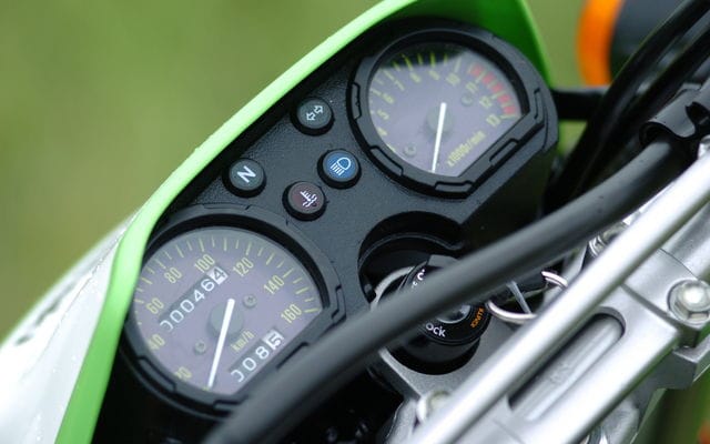 Un autre désavantage que présente la puissance modeste est de limiter les capacités de la KLX à orienter sa direction par la roue arrière. Notre parcours d’essai comprend des chemins forestiers parfois aussi glissants qu’un plancher ciré, et la technique privilégiée dans les virages est de donner de l’accélérateur pour faire patiner un peu l’arrière, comme sur un circuit plat, afin de réduire le risque de dérive de la roue avant. Comme elle manque de ce nerf supplémentaire pour propulser la roue arrière, il faut alors pencher son corps vers l’avant de la selle bien rembourrée afin d’alléger la roue arrière pour lui donner une chance de relâcher. La vitesse maximale indiquée de 120 km/h (très respectable pour une 250) est atteinte sur terrain plat, mais elle descend dans les 100 km/h à la moindre inclinaison. Ceux qui croient en faire une utilisation fréquente hors route feraient peut-être bien de revoir les engrenages en conséquence. La KLX se montre très stable sur les chemins raboteux, filant sur les cahots et la pierraille sans perdre son cap, tandis que ses cousines hors route travaillent du guidon et gigotent de l’arrière, même à ces vitesses. Ses freins sont bien équilibrés, assurant un freinage affirmé mais pas trop sensible, un atout pour le motocycliste débutant.