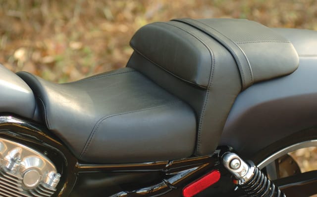 De petites ailes rivetées ont été ajoutées sur l’avant du réservoir (ce n’est pas vraiment le réservoir, c’est le couvert de la boîte à l’air; le carburant se trouve sous la selle). Elles sont munies de treillis d’acier, servant vraisemblablement à garder les petites bestioles à l’extérieur. Les instruments de bord à l’allure déco ont beaucoup de style et s’agencent bien au revêtement d’aluminium du guidon, mais cela soulève une question : pourquoi ne pas tout simplement avoir un guidon d’aluminium, éliminant les revêtements ? Le guidon est positionné à une distance confortable, mais les pieds sont placés loin du corps de la machine. Avec une hauteur de selle de 678 mm (26,7 po), la position de conduite de la V-Rod donne un peu l’impression de s’asseoir dans un kayak.
