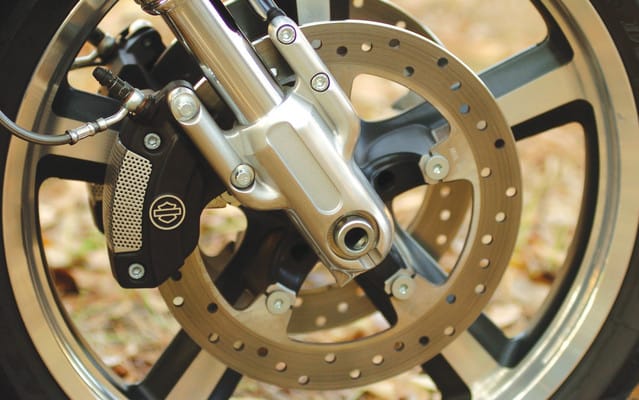 Le pneu arrière mesure 240 mm de large, dépassant les proportions de Josée Lavigueur ! Il devrait être plus mince, mais les gros pneus ont la cote. Il rend le maniement de la moto plus difficile. Il faut donc être patient dans les virages, car les lignes droites sont divines. Les freins, des éléments souvent critiqués sur les Harley, doivent être bons parce qu’on n’a même pas eu l’occasion de se plaindre.