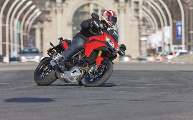 La Multistrada s’offre en trois variantes. Pour 20 995 $, on peut choisir soit notre modèle d’essai (l’édition Sport S) ou la Sport Touring, qui substitue des pièces en plastique aux capot de came, nez et aile arrière en fibre de carbone de la Sport S, mais qui offre en échange des coffres rigides, des poignées chauffantes et une béquille centrale. Les deux versions partagent une suspension électronique et des freins ABS. Le modèle de base, avec fourche Marzocchi et amortisseur Sachs réglables manuellement, sans suspension électronique ni ABS, se détaille à 17 495 $. Les freins ABS sont une option de 1 000 $ et les sacoches devraient se situer autour du même prix. Mais s’il vous plaît, n’achetez pas le modèle de base ; vous avez besoin de la suspension électronique.