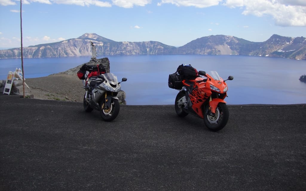 Dur réveil. La forêt est un milieu très humide. Un copieux déjeuner nous a rapidement remis sur pieds. Nous enfourchons nos motos en direction sud pour l’Oregon. Nous nous dirigeons vers un endroit appelé Craterelake qui nous avait été conseillé. Ça valait le détour. Le site est incroyable. C’est un ancien volcan qui s’est rempli d’eau. C’est d’ailleurs le lac le plus profond des États-Unis et l’un des plus profonds au monde avec ses 592 m. C’est, de plus, un lac situé en haute altitude. Le plus haut sommet du site culmine à près de 3 000 m. Il y avait encore de la neige lors de notre passage.