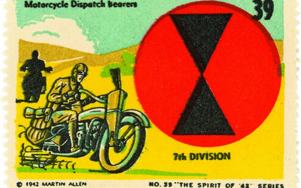 La collection de Richard Ackroyd ne comprend pas que des timbres. On y trouve aussi des cartes postales avec des illustrations de motos. Il y en a une où, curieusement, on explique que c’est une moto (une Indian) qui a transporté les dernières lettres expédiées PAR AVION au tarif de 10 cents aux États-Unis. Sur une autre, datée de 1937, on voit des motos sur une route de terre avec des spectateurs le long d’une clôture; sur le timbre, une image d’Adolph Hitler. On trouve aussi toute une variété d’autocollants qui ressemblent à des timbres et qui mettent en scène des motos. Une enveloppe nous a paru particulièrement touchante. Elle a été envoyée en septembre 1942 par Russell Eddy à M. et Mme Ray Eddy depuis l’hôpital militaire de Washington, D.C. En haut à droite, quelqu’un – sans doute Russell – y a ajouté un faux timbre avec une moto dessinée et le mot « FREE! ».