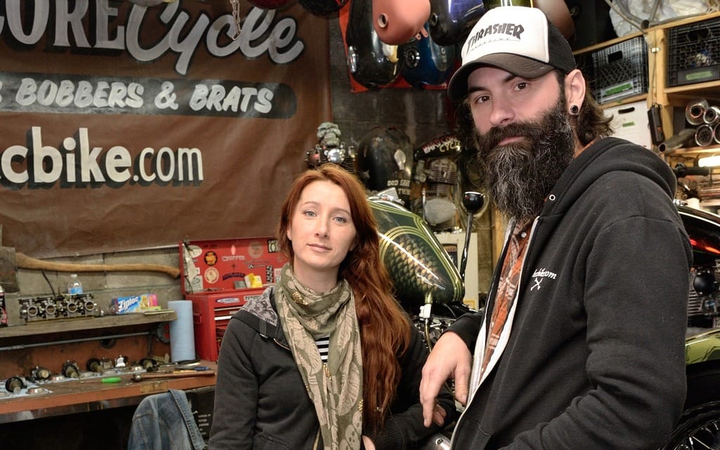 J’ai commencé dans le domaine des deux roues en fabriquant des choppers chromés à pédales pendant trois ans, mais étant donné la clientèle restreinte je me suis tourné vers autre chose. J’ai suivi un cours de mécanique industrielle et travaillé quelques années en usine. Ensuite, je me suis initié aux motos durant les soirs et les fins de semaine en travaillant sur le petit bobber (le projet d’Éric Morin) de là la piqure! Après, tout s’est déroulé rapidement, j’ai obtenu mon permis moto, moi qui n’avais jamais piloté ces engins! De là est né Hardcore Cycle et j’y travaille depuis deux ans à temps plein (j’avais commencé un an auparavant à temps partiel).