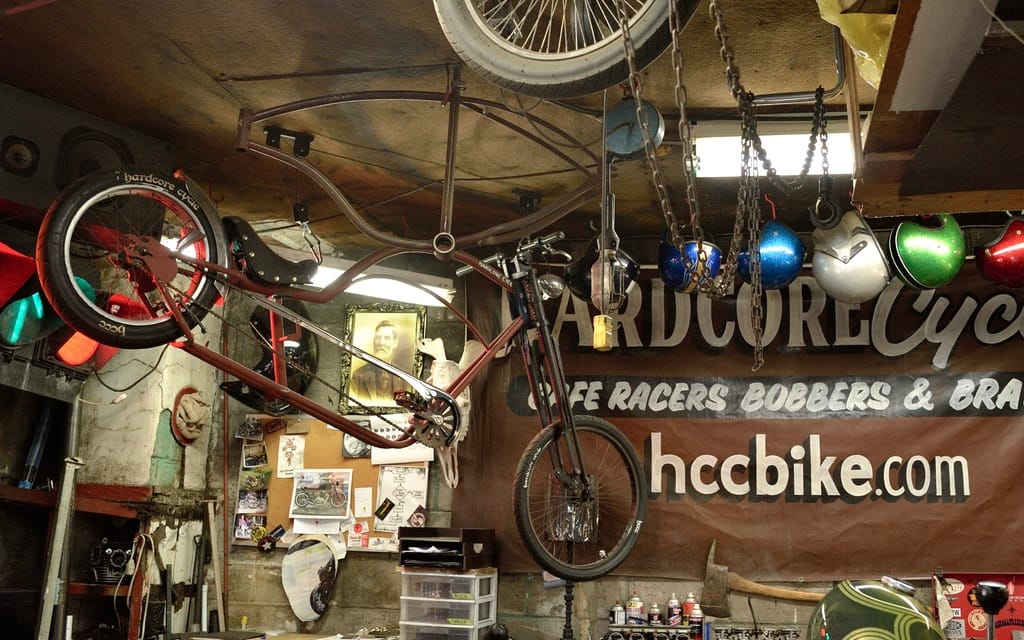 En entrant chez Harcore Cycle, les motos rendues à divers stades dans leur processus de métamorphose attirent bien sûr notre attention, mais le décor nous frappe encore plus. Il y a d’abord toutes les pièces superflues des projets réalisés qui serviront peut-être un jour sur une autre moto. Accrochée au plafond, une amusante collection de casques metal flake – qui étaient à la mode dans les années 70 – côtoie des réservoirs de la même époque qui n’attendent qu’on fasse appel à eux. Des feux de circulation, dont toutes les couleurs sont allumées en même temps, semblent nous dire qu’ici, il n’y a pas de restriction à votre imagination. L’objet le plus inusité, trônant lui aussi au plafond, est sans contredit un chopper à pédales d’une telle envergure qu’il ne peut être installé sur un support à vélo en arrière d’une auto tellement il dépasserait de chaque côté! Que fait ce singulier engin à pédales? Éric Morin nous en raconte l’origine dans l’encadré en bas de page.