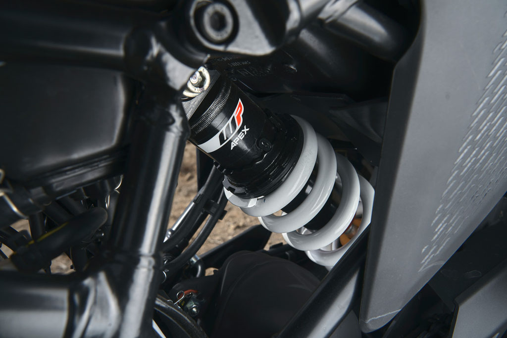 Ce moteur à quatre temps de 373,2 cm3 monocylindre refroidi par liquide propulse parfaitement cette petite machine agile dans le monde de l’aventure. On l’a bien sûr équipé d’un démarreur électrique et les doubles arbres à cames en tête, ses quatre soupapes, l’injection électronique de carburant et le ride-by-wire s’assemblent pour nous donner un moteur étonnamment puissant et flexible. On l’a aussi muni d’un radiateur plus volumineux pour améliorer sa performance.