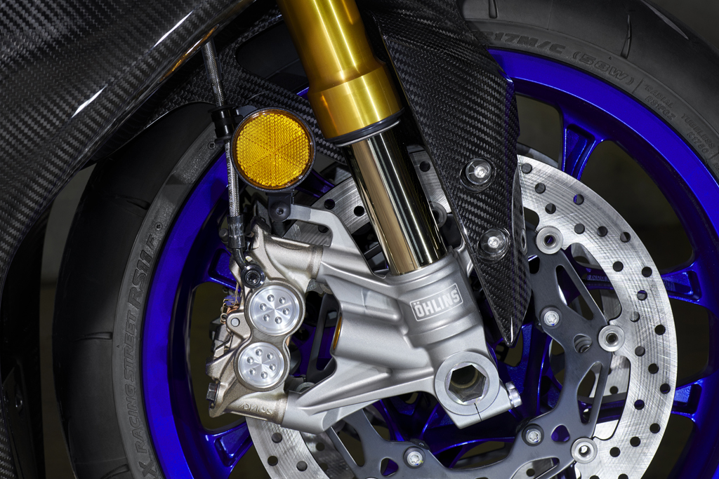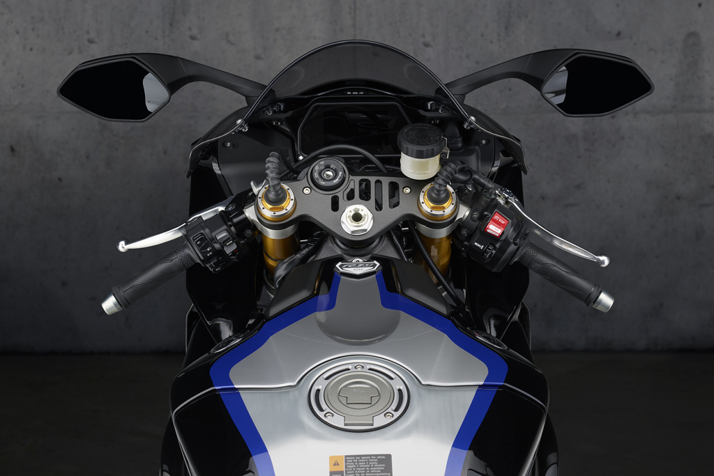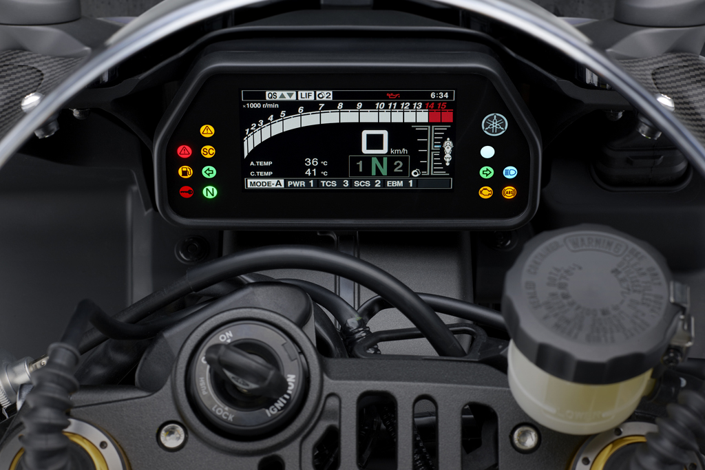 Le manuel du propriétaire consacre 55 pages à la panoplie de dispositifs électroniques de la R1M et aux différentes fonctions accessibles par l’intermédiaire des contrôles et des instruments. Il y a quatre modes de conduite, chacun comprenant différents ajustements par défaut pour plusieurs paramètres : livraison de la puissance, antipatinage, comportement des freins, ABS, contrôle des dérapages, contrôle des wheelies, frein moteur, quickshift, etc. Il y a littéralement des centaines d’ajustements possibles que l’on peut faire défiler sur l’écran TFT (transistor en couches minces). De plus, on peut choisir entre un affichage piste ou un affichage route, et sélectionner les données présentées ainsi que la façon de les afficher. La suspension permet d’ajuster de manière indépendante l’amortissement en compression et en détente.