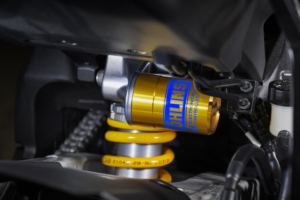 Au même titre que pour les autres systèmes (ABS, antipatinage, etc.), le mode de conduite choisi attribue certains paramètres de base pour la suspension à ajustement électronique. Après avoir roulé pendant un bon moment en mode A, nous passons en mode M1 afin de pouvoir augmenter l’amortissement en détente à l’arrière et diminuer ainsi les dérapages à effet yoyo, toujours dans le but de réduire encore les temps au tour; excellent, mais le contrôle de l’amortissement en compression lente et rapide est offert uniquement avec la suspension à ajustement manuel de la R1.