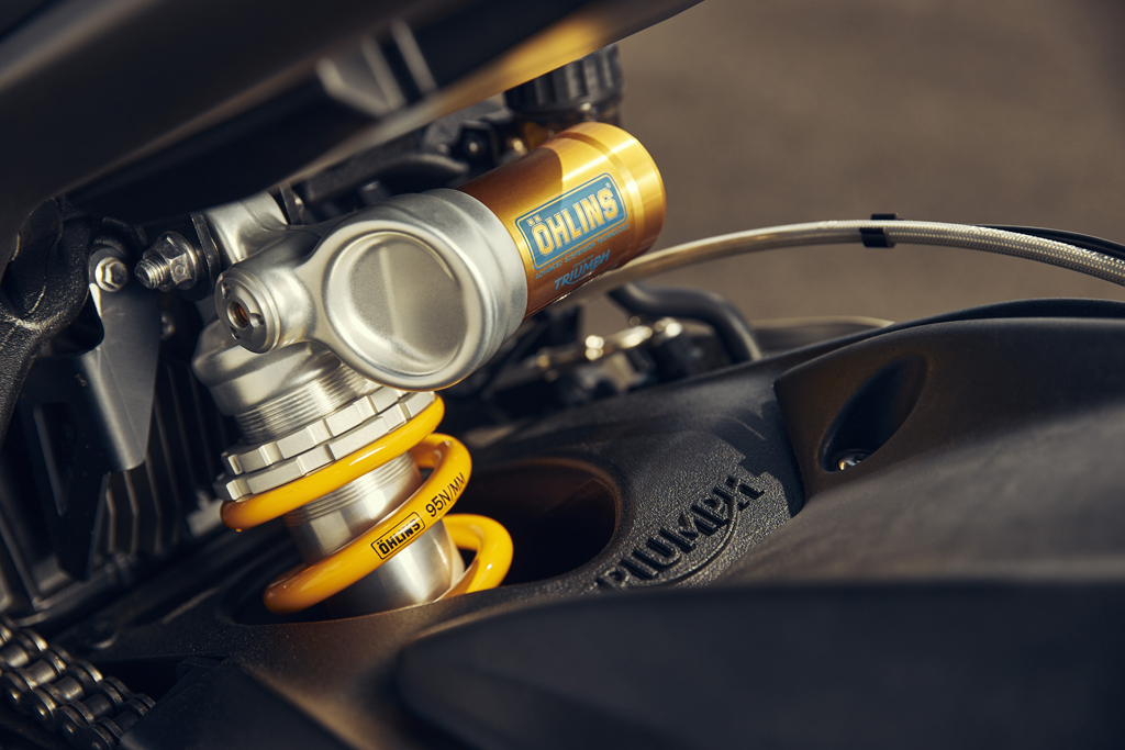 La Street Triple 765 Moto2™ Edition met en avant ses capacités sur circuit grâce à sa fourche inversée Öhlins de 43 mm pour une maniabilité précise et un amortisseur arrière Öhlins à réservoir séparé. Le débattement des roues avant sur tous les modèles est de 115 mm, celui des roues arrière de 131,2 mm sur la RS et l’édition Moto2™, et de 133,5 mm sur la Street Triple R.