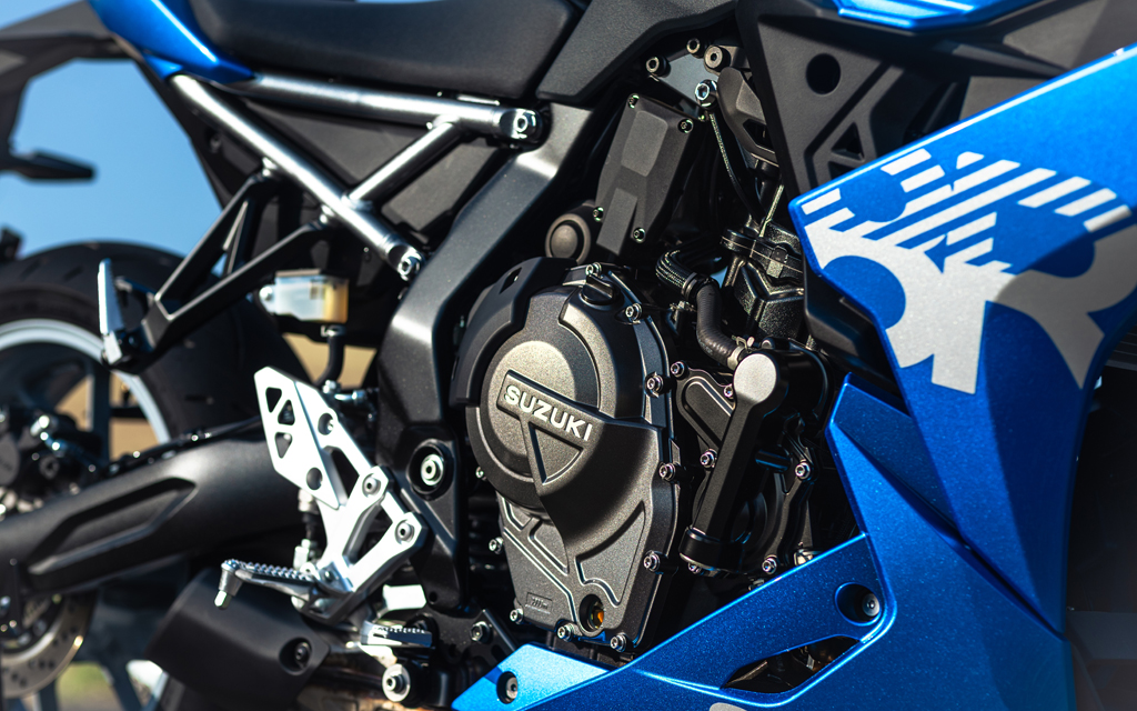 La GSX-8R s’appuie sur les solides avancées techniques pour lesquelles la série GSX-S est reconnue. L’élément central est le moteur bicylindre parallèle Suzuki de nouvelle génération à double arbre à cames en tête de 776 cm³, qui a été bien accueilli lors de sa sortie l’année dernière.