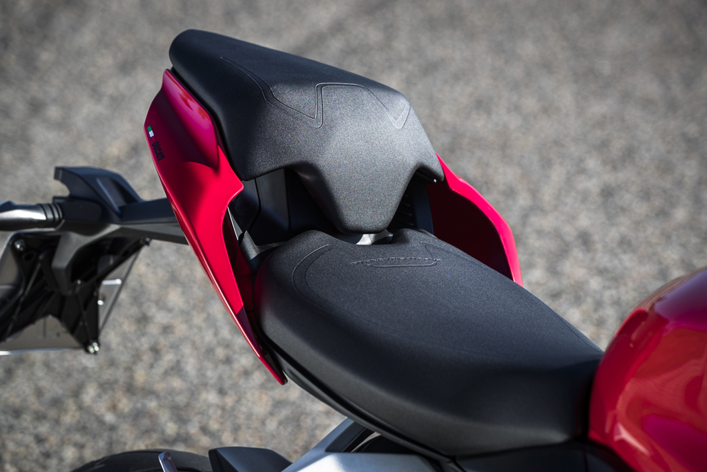 Sa position de conduite est plus sportive que la moyenne chez les standards avec des repose-pieds hauts et reculés ainsi qu’un guidon juste assez bas pour pencher un peu le torse vers l’avant, mais pas au point de charger les poignets. Comme c’est commun chez les Ducati animées par un V-Twin, la mécanique n’aime pas traîner sous les 2000 tr/min sur le troisième rapport et plus, mais elle se montre très agréable ensuite. Au-dessus de ce seuil, un très bon couple à bas et moyen régimes suivi par un punch excitant sans être extrême à haut régime permet au pilote soit d’adopter un rythme détendu en gardant les tours bas, soit de passer en mode Superbike Mondial, ou encore d’alterner entre les deux. Un sélecteur de vitesses assisté en montée et en descente est installé de série tandis qu’un module de mesure inertielle (IMU) à six axes gère une suite d’aides électroniques au pilotage comportant l’ABS, des contrôles de traction, de wheelies et de frein-moteur, ainsi que trois modes de conduite et trois modes de puissance dont le plus faible réduit la puissance de 153 ch à 110 ch.