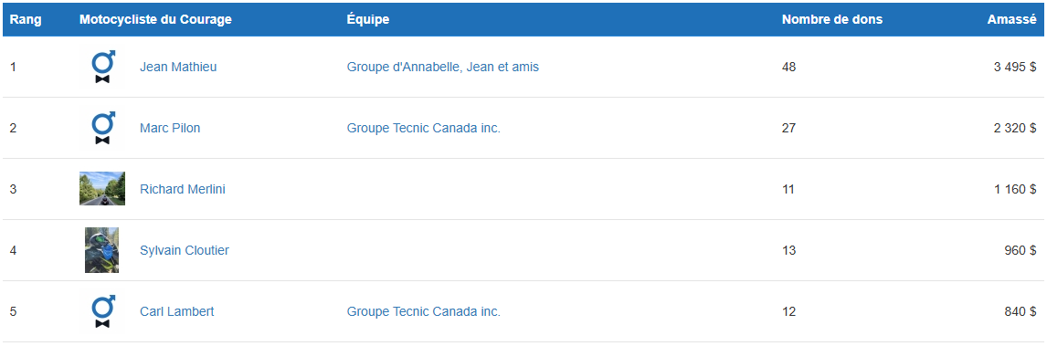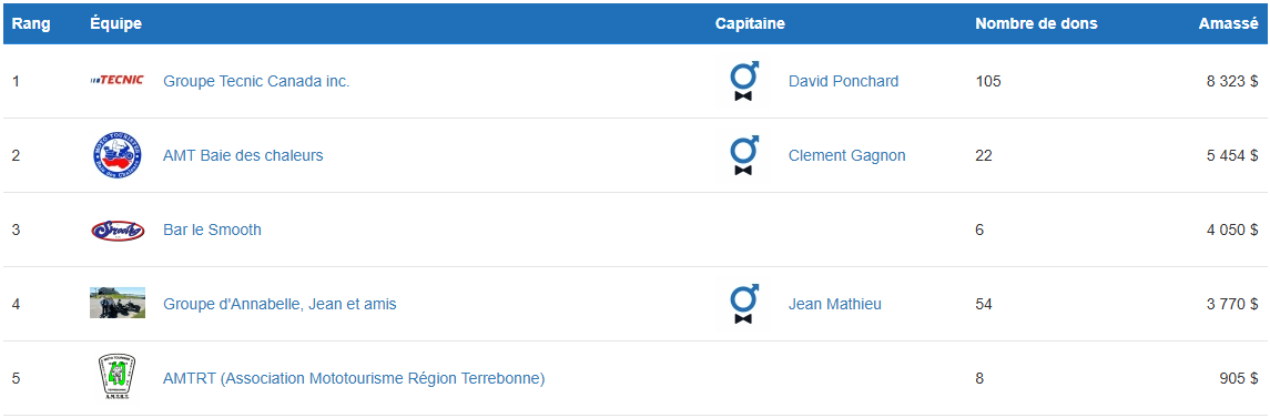 Voici le top 5 des équipes qui ont amassé le plus de dons :