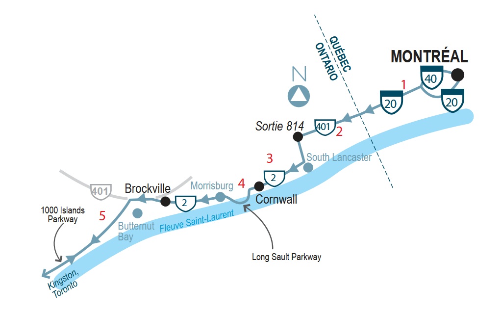 Tout d’abord, il vous faut quitter Montréal en direction de Toronto en empruntant soit l’autoroute 40 ou l’autoroute 20 en direction ouest (1). Vous pourrez laisser cette voie rapide (devenue la 401) (2) après environ 90 km en prenant la sortie 814 pour South Lancaster. À l’intersection, tournez à droite vers le sud en direction du fleuve Saint-Laurent. À la première intersection, prenez encore à droite la route 2 vers Cornwall (3). La route 2 se nomme également Old Montreal Road ou Ontario Kings Highway, et parfois aussi Old Heritage Road.
